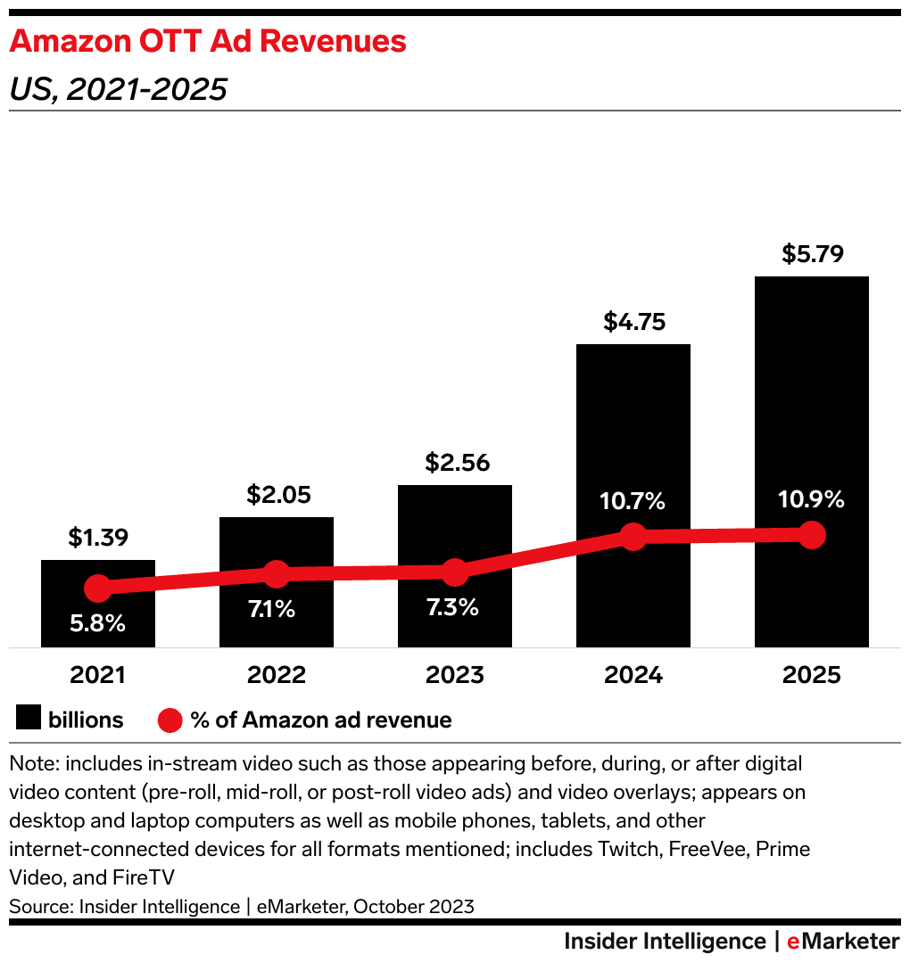 Amazon’s OTT ad revenues will nearly double in 2024, according to our October 2023 forecast, as ads come to Prime Video. Previously, ad revenues came from Amazon properties like Freevee, Fire TV, and Twitch.