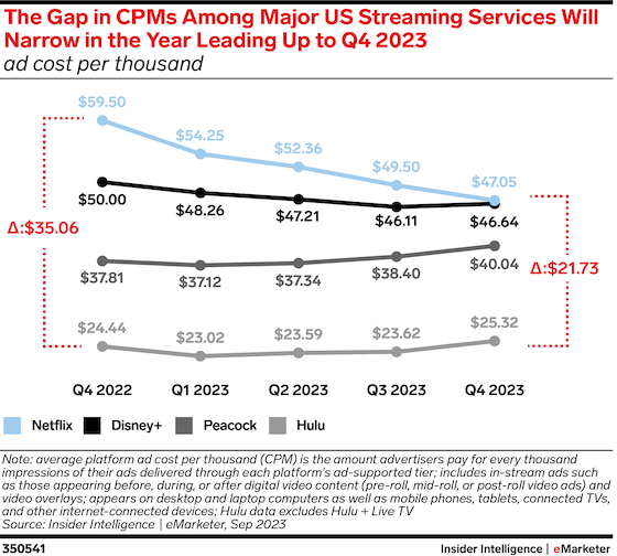 Key stat: The gap in ad cost per thousand (CPM) between Netflix’s high and Hulu’s low decreased over the last year, resulting in a projected difference of $21.73, according to our forecast.