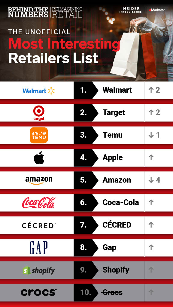 Walmart makes a huge acquisition in hopes of taking on Amazon’s retail media dominance, while Amazon keeps churning out generative AI innovations. Plus, Target tries to steal share from Walmart’s prowess on attracting deal-seeking shoppers. Find out who else earned a spot in our Unofficial” Most Interesting Retailers List, a monthly ranking revealed on an episode of the “Behind the Numbers: Reimagining Retail” podcast.