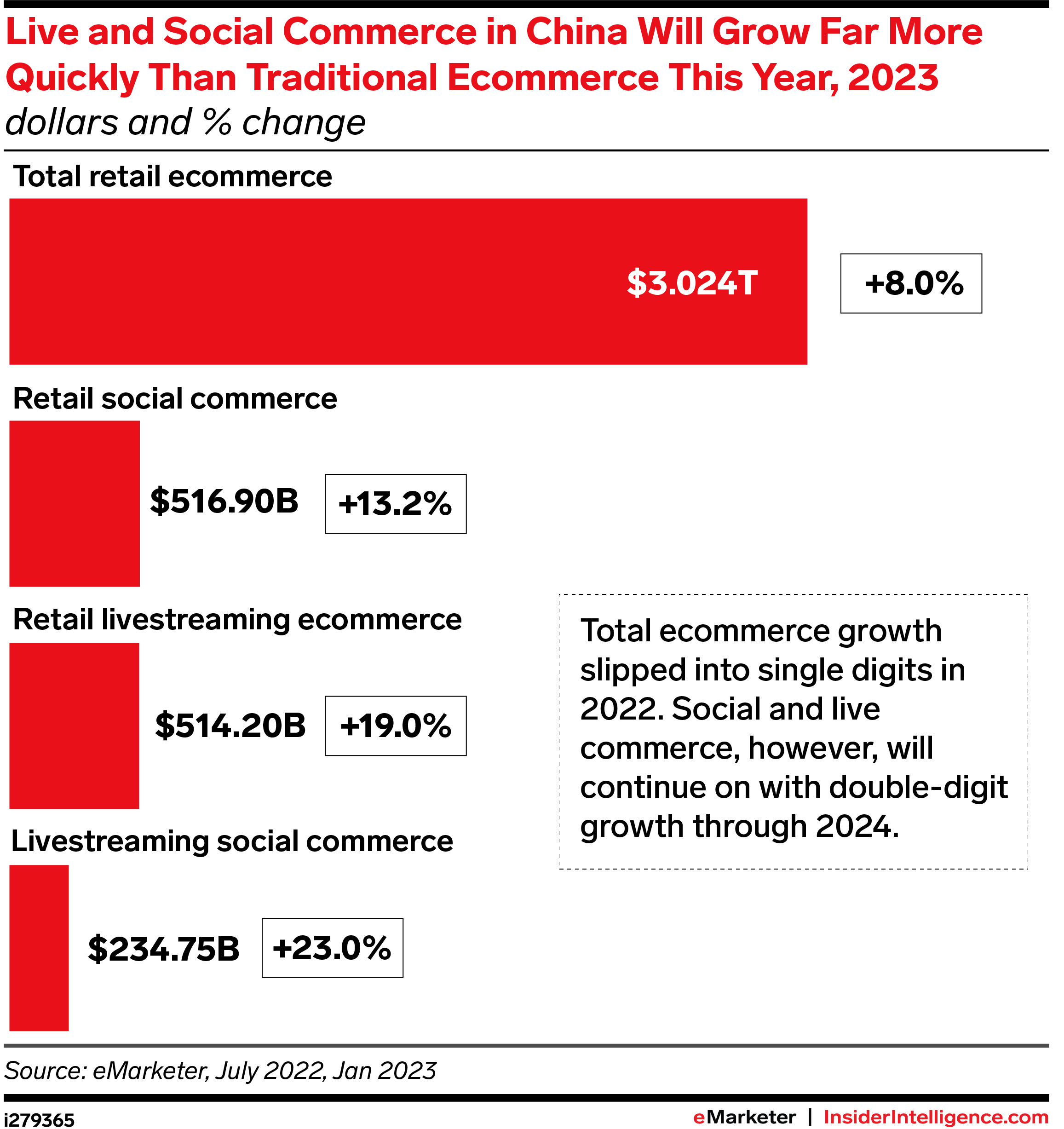 Overall ecommerce growth is fizzling in China, so brands and marketers will need to shift their attention to emerging channels. The country’s 10-year-plus digital buying boom is no more. Retail ecommerce sales growth dropped to single digits in 2022 and will remain there throughout our forecast period.