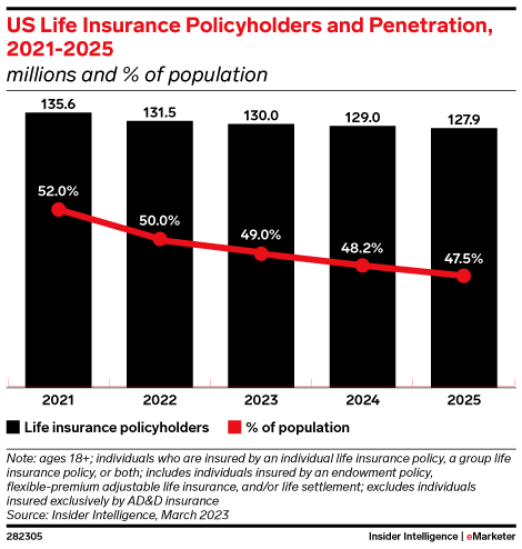 KEY STAT: US life insurance penetration pales in comparison to other lines, like auto insurance (75.3% of US adults in 2023). As it continues to drop, insurers will need to rely on embedded insurance to mine what pockets of growth remain.