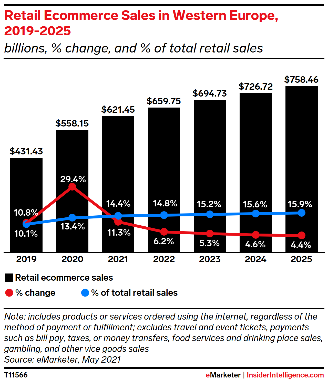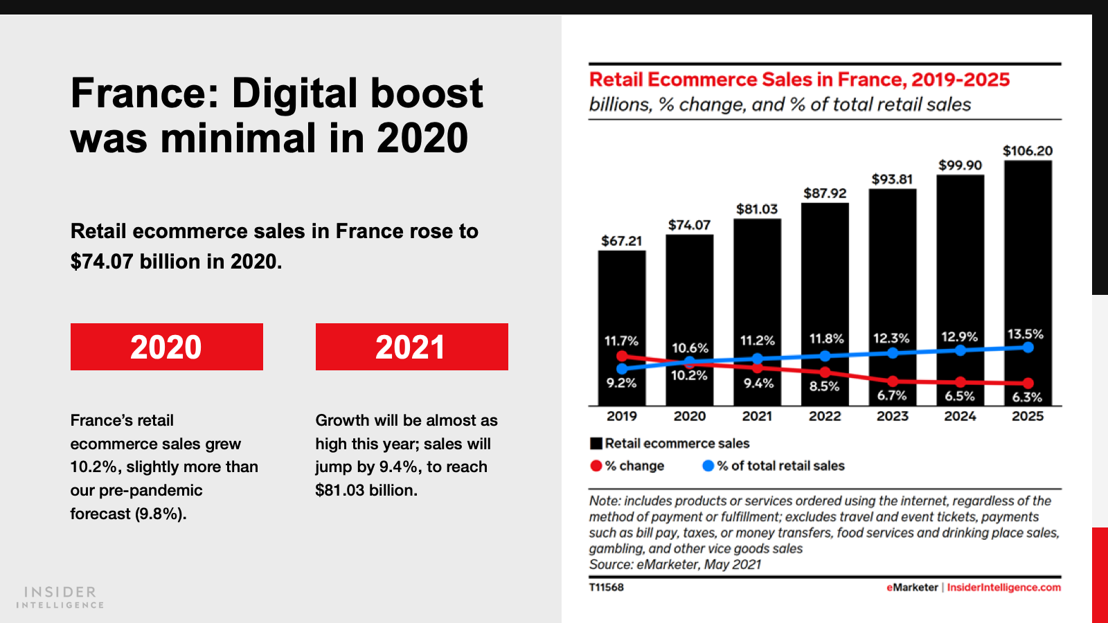 KEY STAT: Across Western Europe, retail ecommerce jumped 29.4% in 2020. This year, France and Germany will both post single-digit gains, with digital sales reaching $81.03 billion (€71.06 billion) and $101.20 billion (€88.75 billion), respectively.