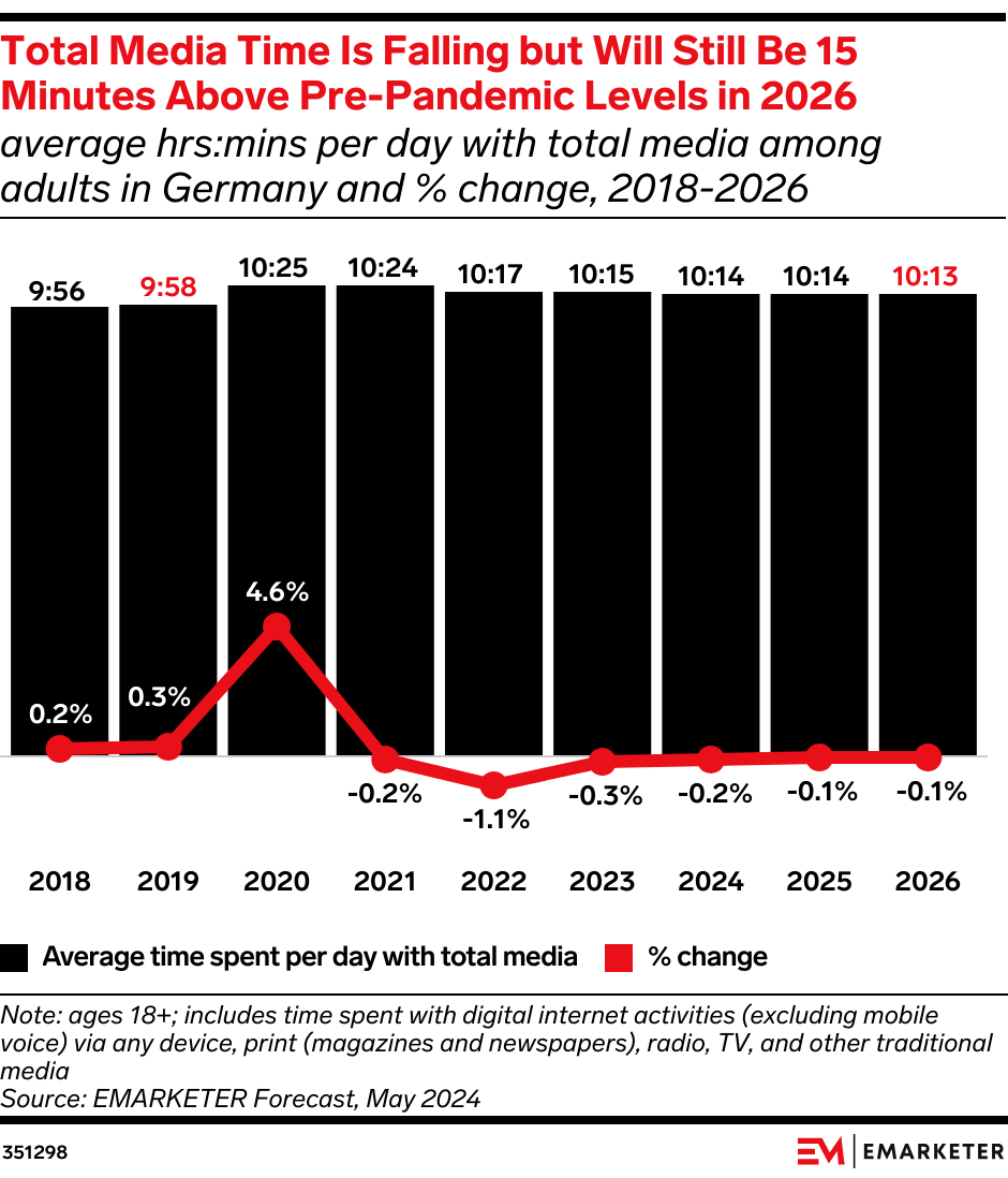 The media environment in Germany continues to be dominated by traditional media, as the country’s aging population shapes the narrative. That said, time spent with traditional media will slowly decline, while digital will pick up the slack, leading to stability in overall media time.