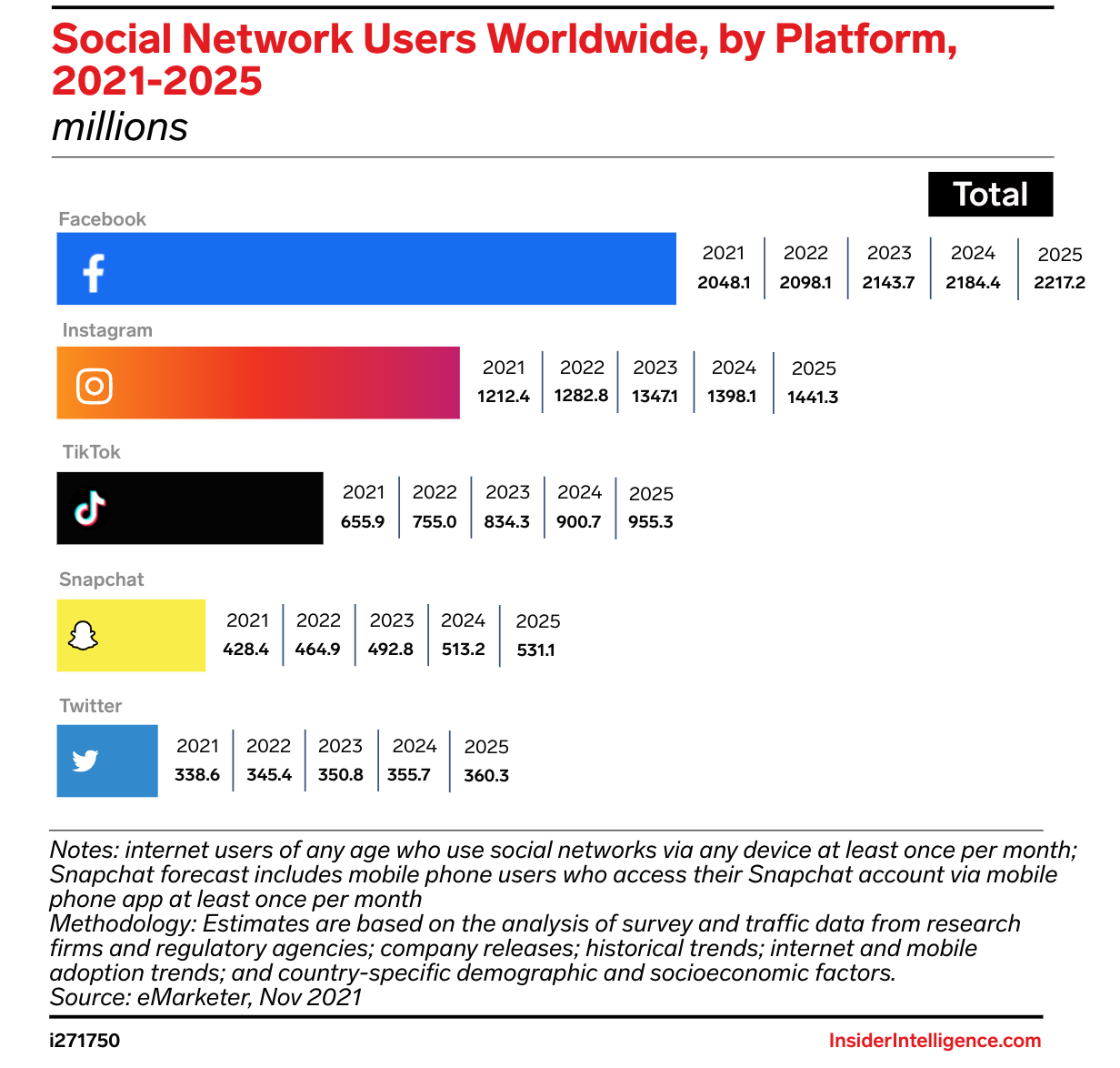 WHAT’S IN THIS REPORT? This report presents our latest forecasts for global social network users through 2025 and identifies the top usage trends for Facebook, Instagram, Snapchat, TikTok, and Twitter.