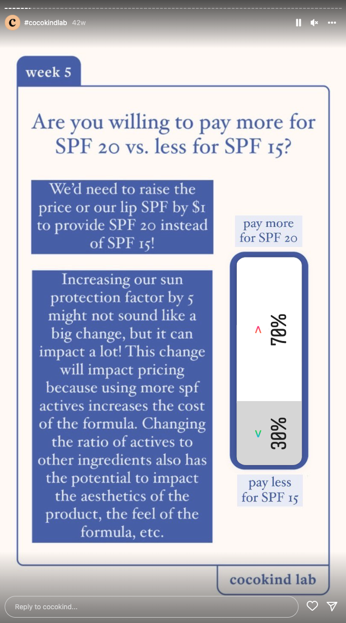 Cocokind uses its community directly for R&D. With Cocokind Lab, the company polls customers along every step of the product development lifecycle, asking questions about preferred colors, packaging, ingredients, and more—with around 30,000 responses each time. I highly recommend checking out this series of Instagram Stories from Cocokind Lab, where the company develops a new lip SPF product entirely from community feedback.