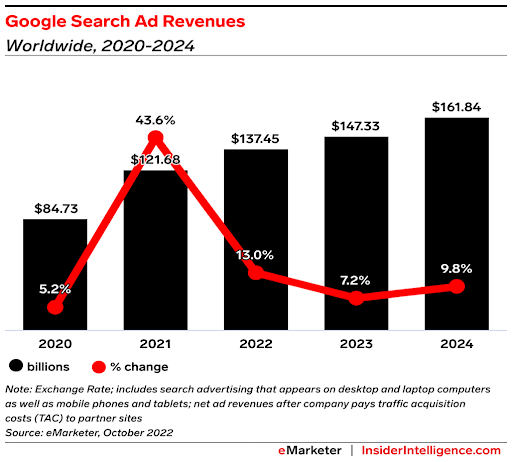 When it comes to search, Google is king. This year, its ad revenues will total over $137 billion, representing a whopping 56.1% of total search ad spending.