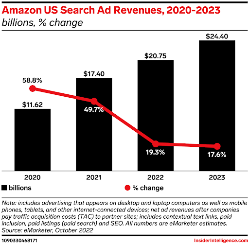 While Google still reigns, Amazon is coming for its crown. We predict that the ecommerce giant will rake in $24.40 billion in ad revenues next year, growing its share of total ad spending to nearly 25%.