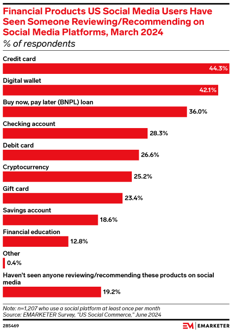 Key Stat: Around 80% of US social media users have seen someone reviewing or recommending financial products on social media, per our March 2024 survey. That widespread reach highlights how payment providers can use influencers to raise awareness of their brand.