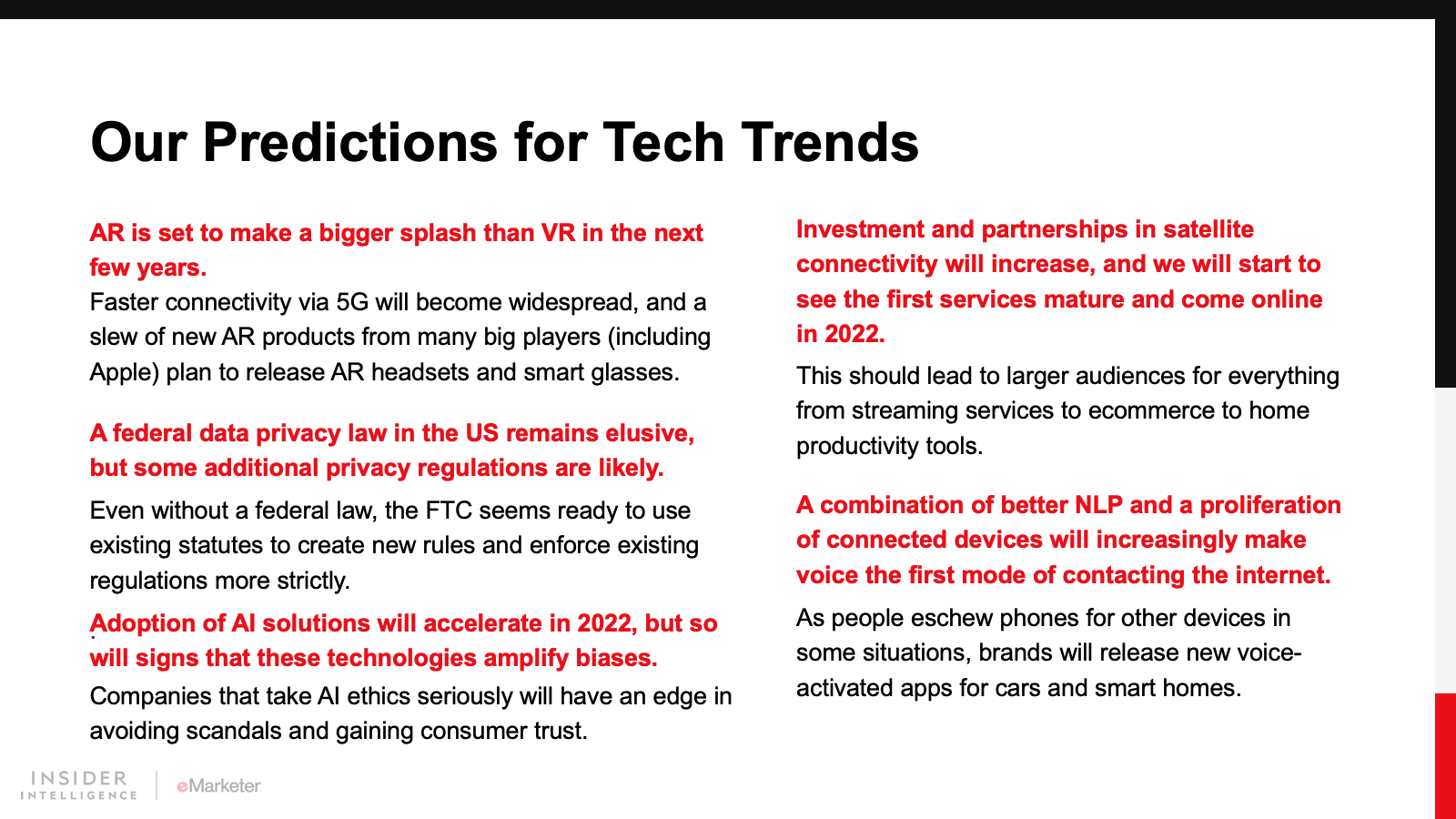 Big technology bets—mRNA vaccines, videoconferencing, and rapid delivery—won during the pandemic. In 2022, the tech industry will make some new bets on the future, including space-based internet, the metaverse, and voice-based internet. But it will also need to overcome consumer and government concerns about bias and privacy.