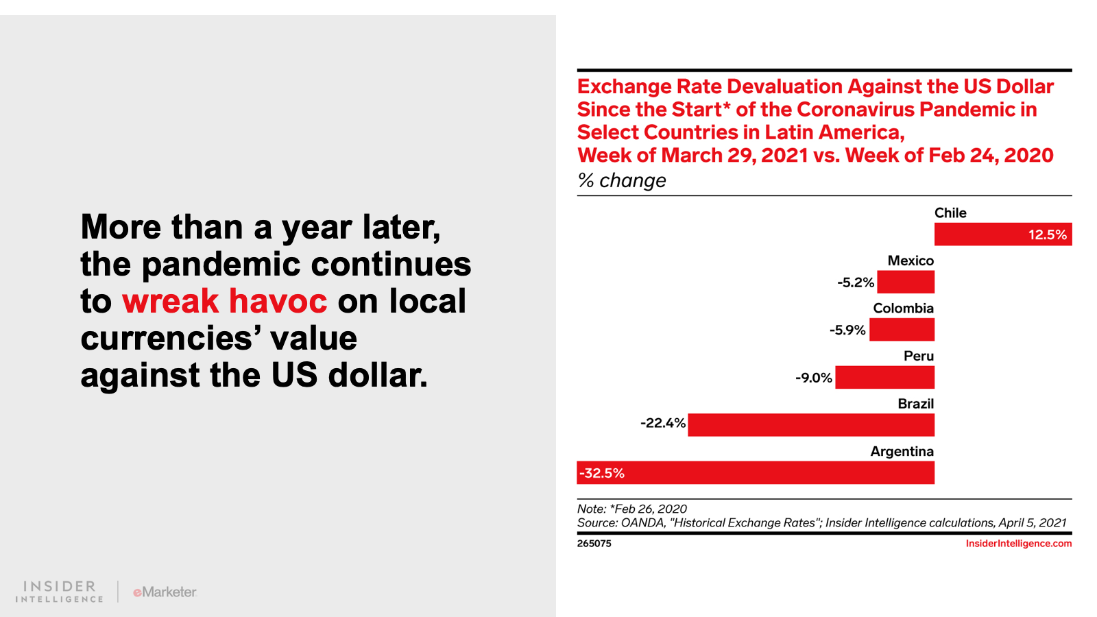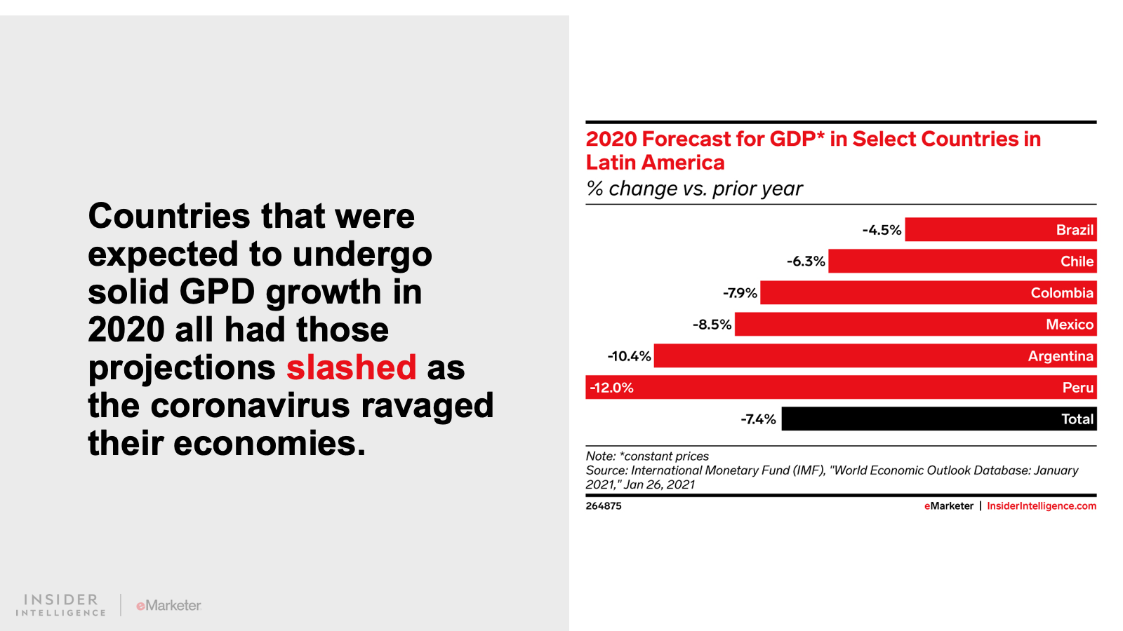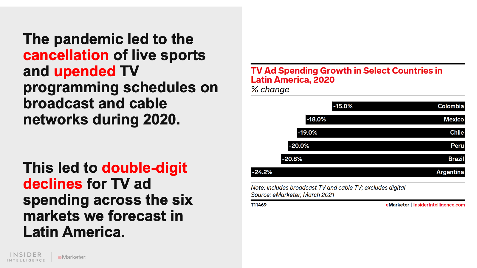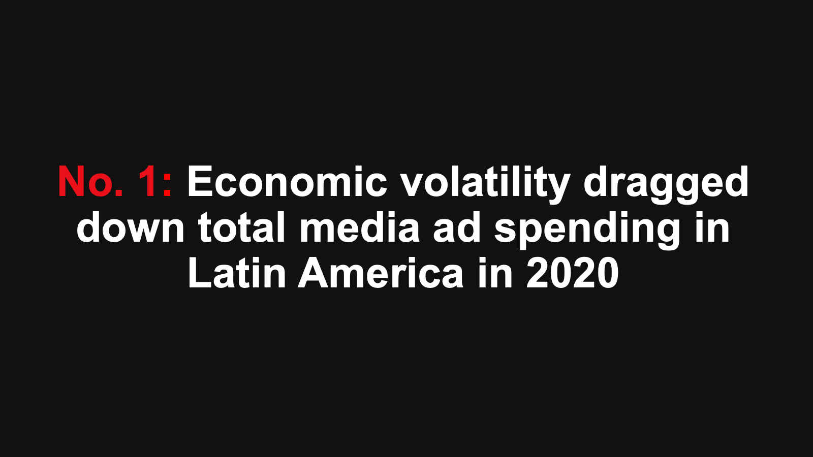 A combination of government-mandated lockdowns, local currency devaluations against the US dollar, and the cancellation of major sporting events prompted total regional outlays to fall 13.1% year over year (YoY) to $20.82 billion in 2020. Last year, all six of the Latin American markets covered in this report were among the top 10 worst-performing ad markets we forecast.