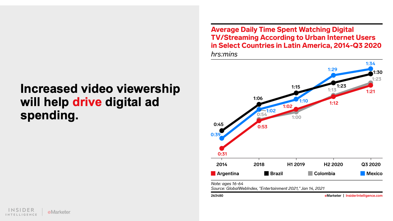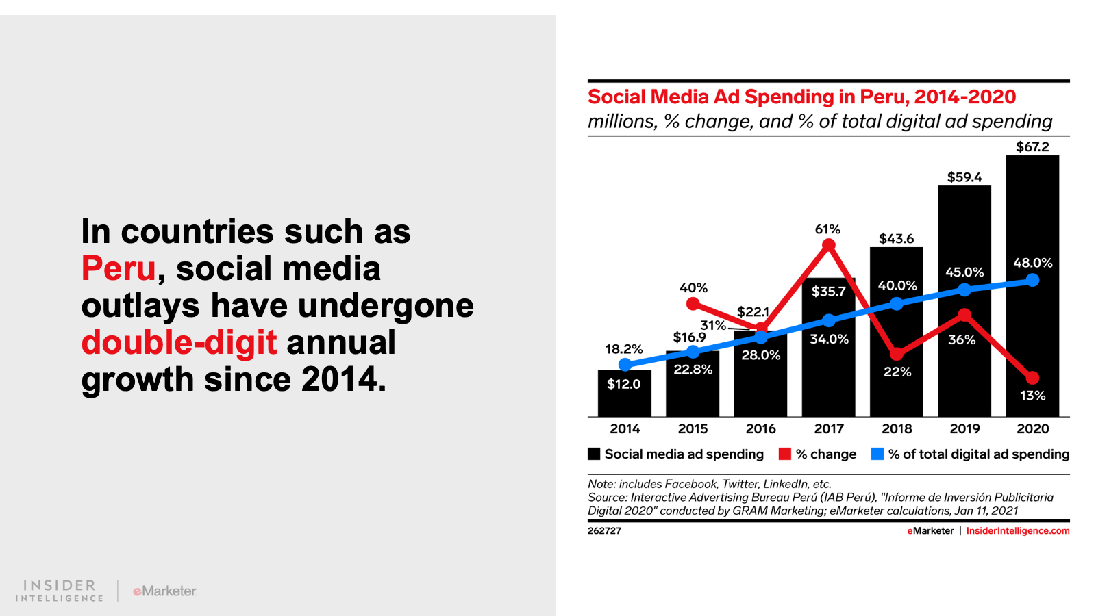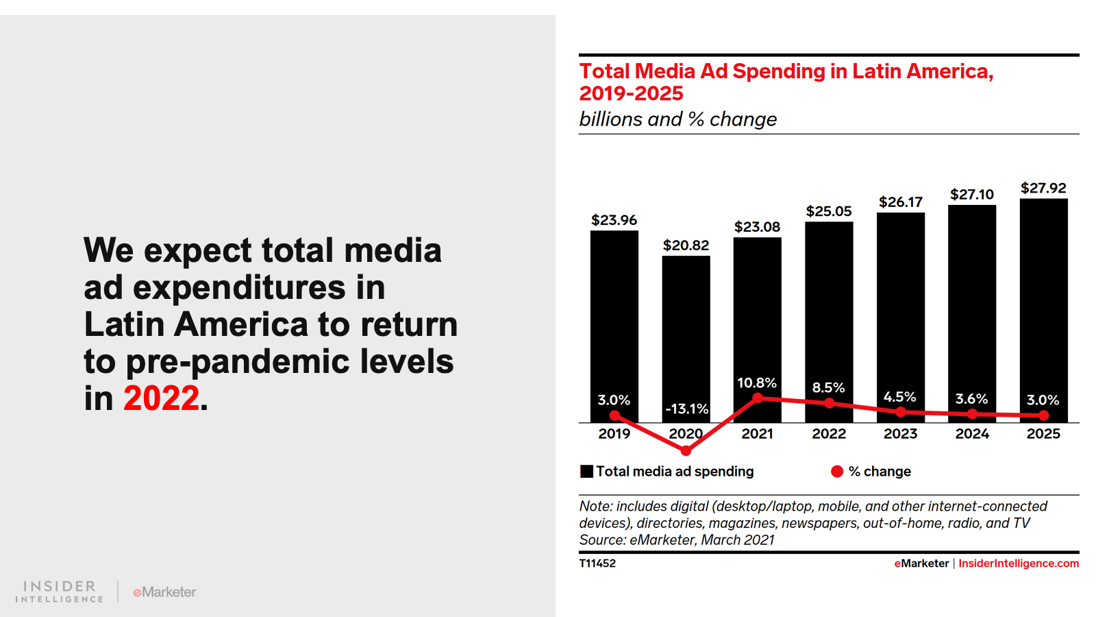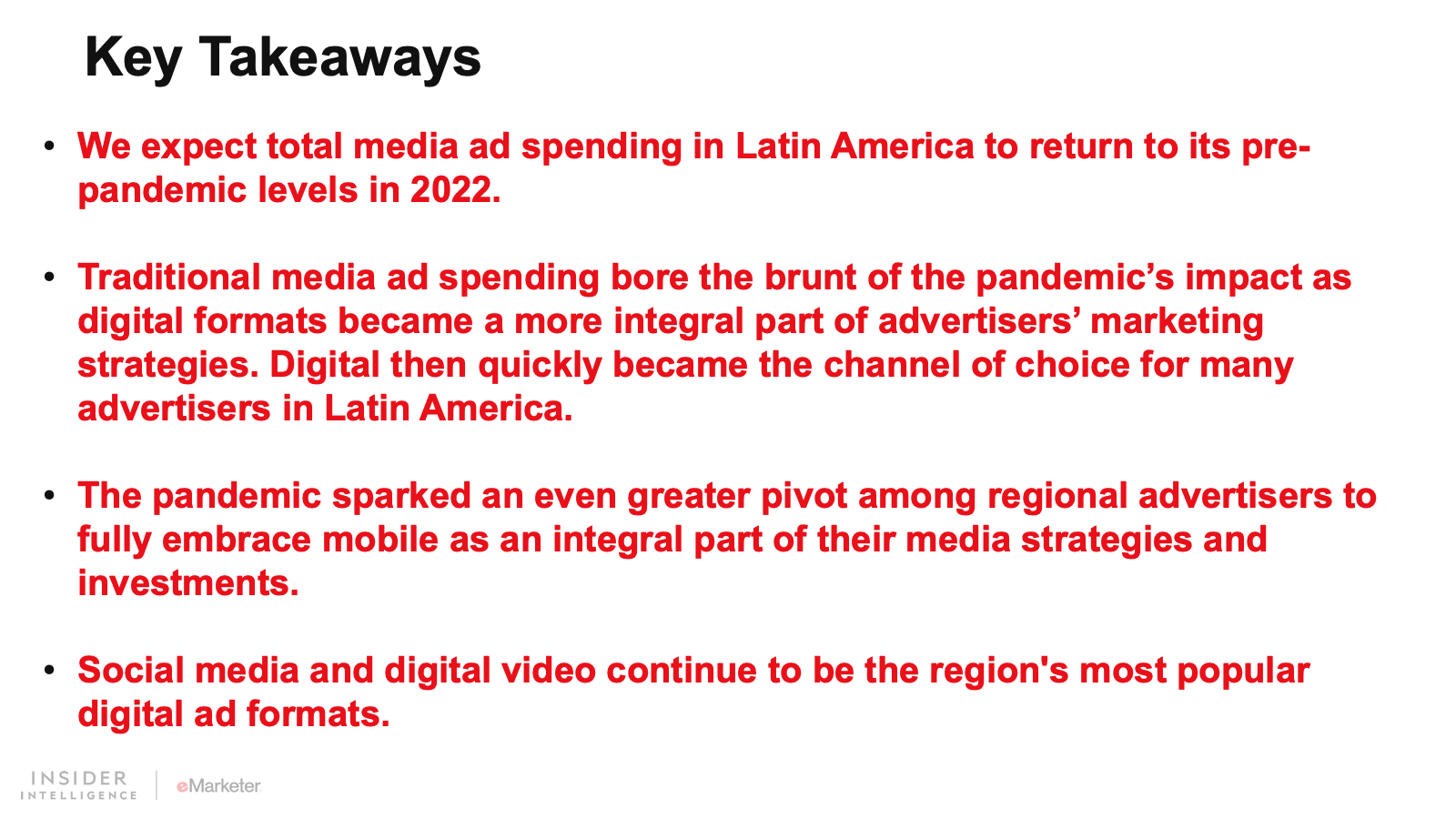 We expect that digital ad spending in Latin America will grow 15.0% to $9.96 billion. Spend will continue to grow at an accelerated pace as consumers adopt a more digital-first lifestyle. Digital platforms will claim 43.2% of all media spending, fueled by growth in the region’s two largest ad markets, Brazil and Mexico.