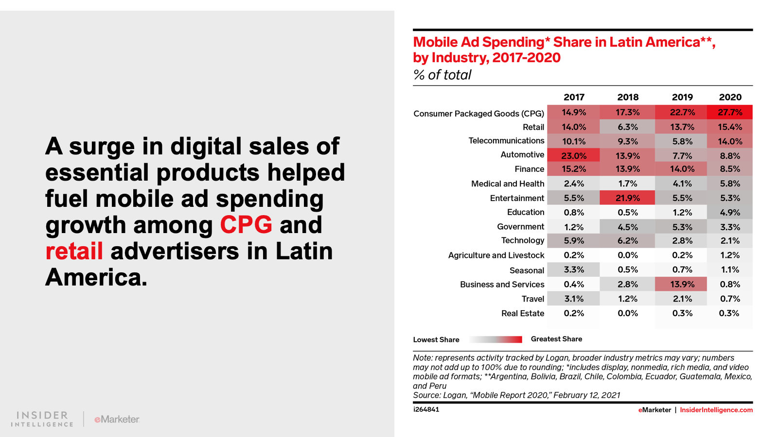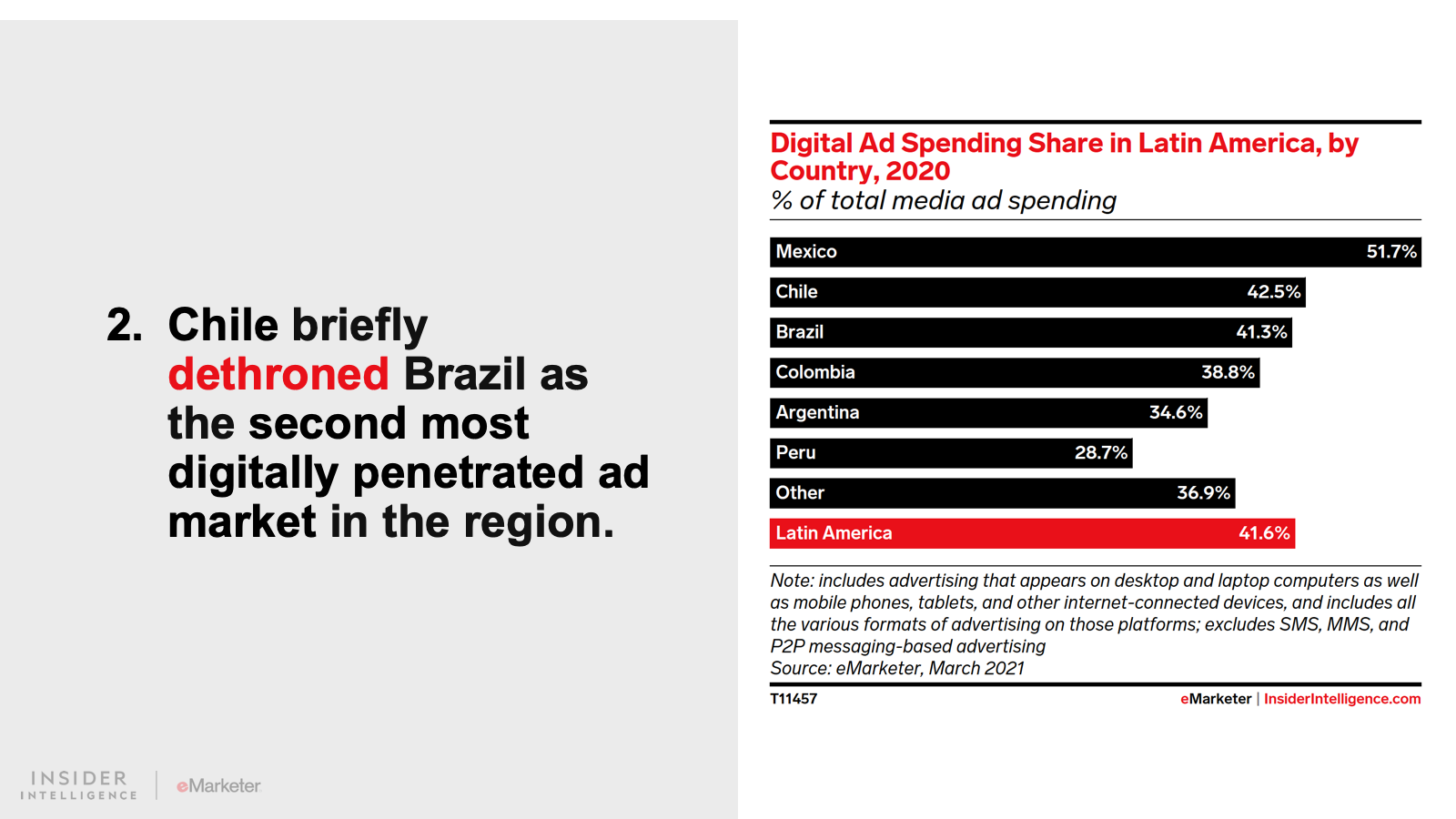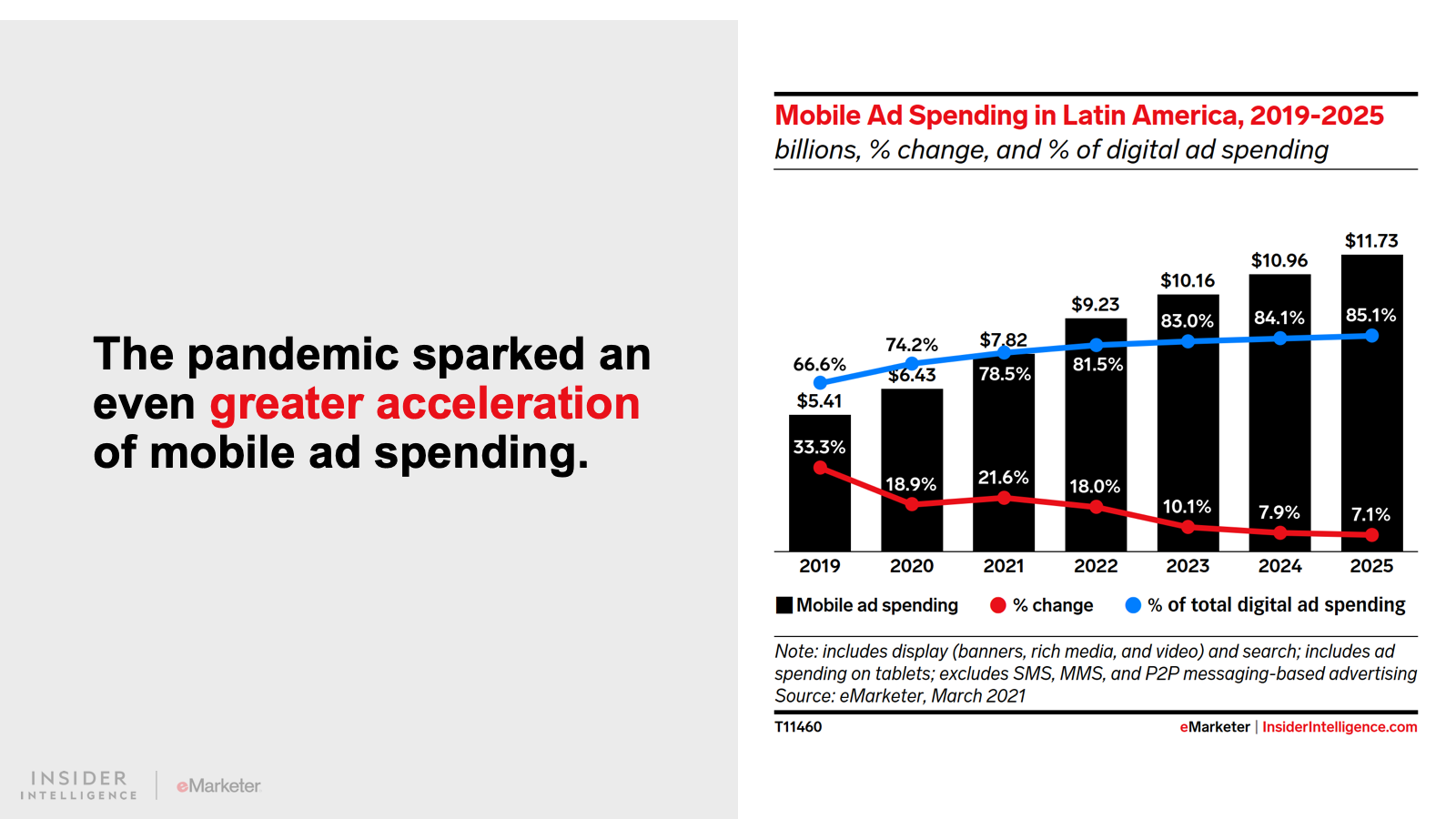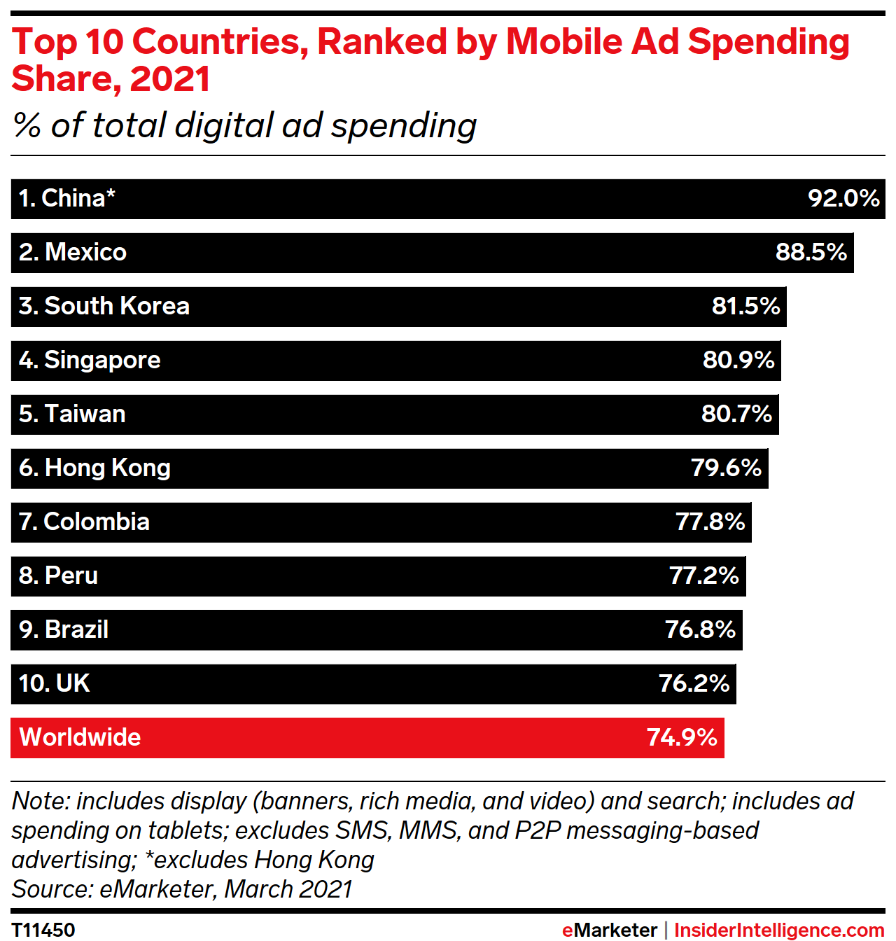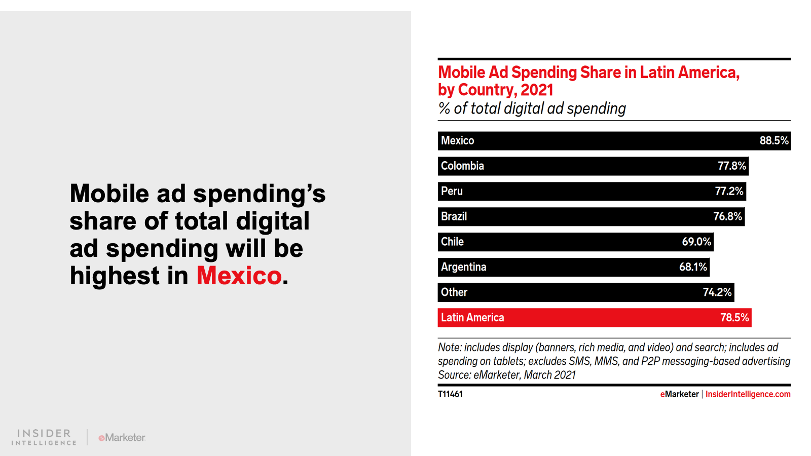 KEY STAT: Digital ad spending in Latin America will largely be focused on mobile devices in 2021. For example, mobile ad spending in Mexico will account for 88.5% of digital ad spending, the second-highest share in the world behind China’s 92.0%.