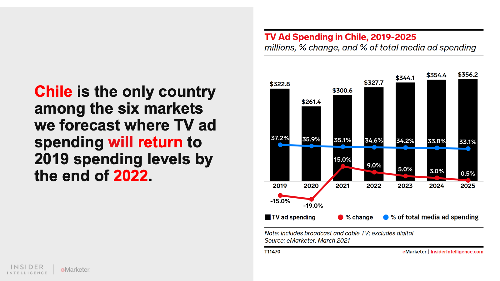We do not expect TV outlays to bounce back to their pre-pandemic levels over the remainder of the forecast period in five of the six markets we cover. Chile is the only exception, where we project that TV ad spending will return to 2019 spending levels by the end of 2022.