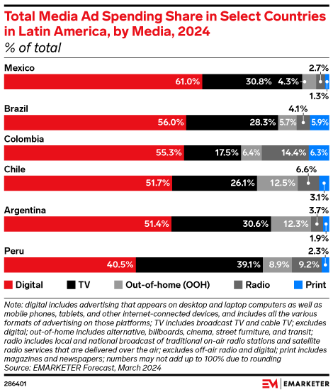 Key Stat: Although digital’s share of total media ad spending in Latin America first exceeded 50% in 2022, Argentina and Chile will reach that milestone this year for the first time, as advertisers reduce their reliance on traditional media like TV.