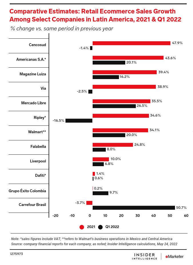 KEY STAT: In Q1 2022, the ecommerce sales growth of Americanas S.A. and Cencosud—two of the fastest-growing companies in 2021—slowed, reflecting a changing retail ecommerce landscape.