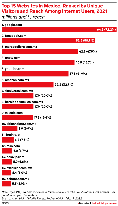 KEY STAT: Mercado Libre’s and Amazon’s country-specific domains in Mexico boasted audiences greater than that of the country’s leading publishers in 2021, per Admetricks, making them attractive destinations for ad investments.