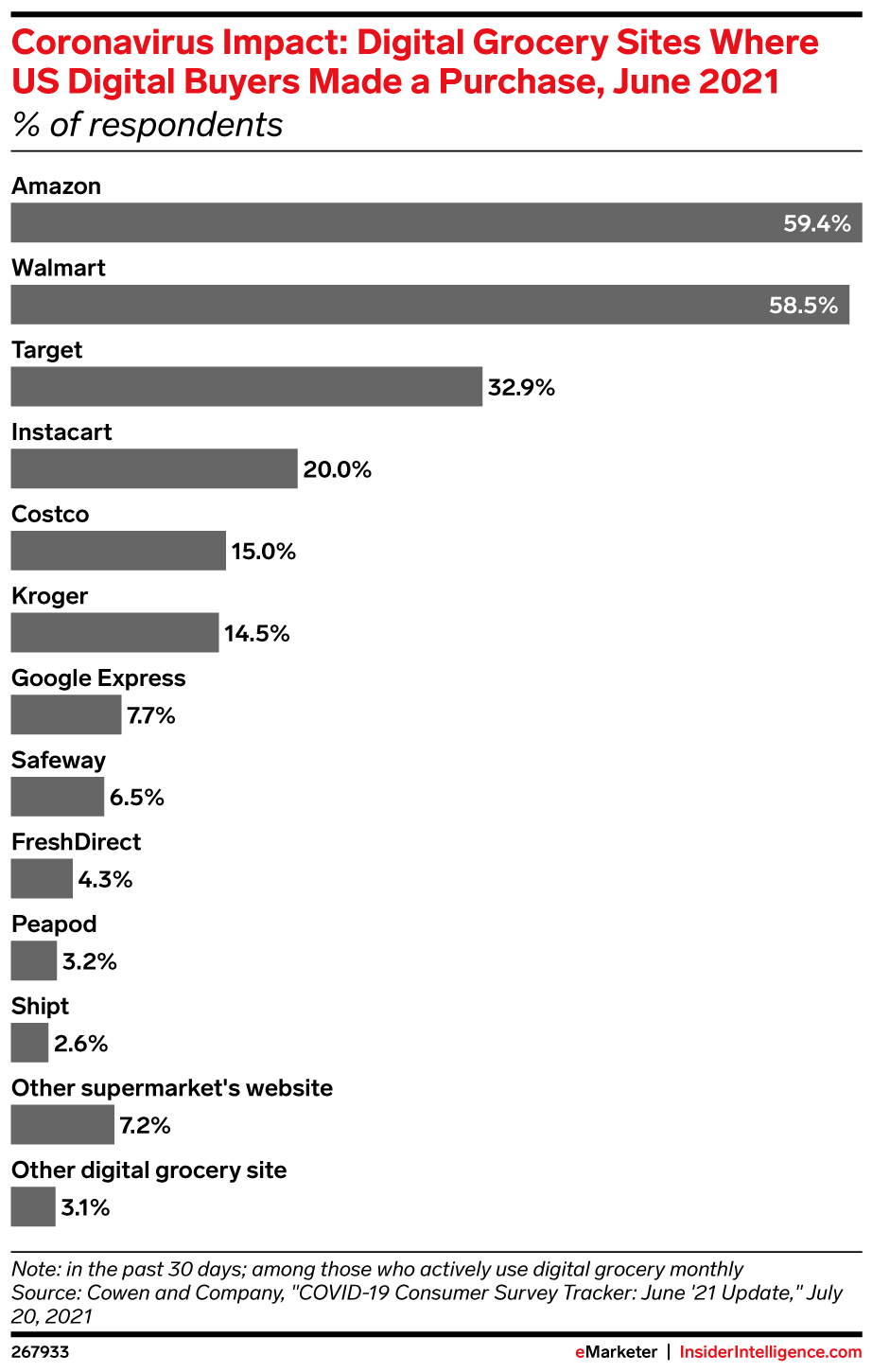 Nearly 60% of US digital grocery buyers said they had bought from Amazon or the Walmart site in the past month, according to a June 2021 study by Cowen and Company. Grocery-specific platforms like Instacart and Kroger saw much lower response rates, while FreshDirect and other grocers’ sites registered shares in the low single digits.
