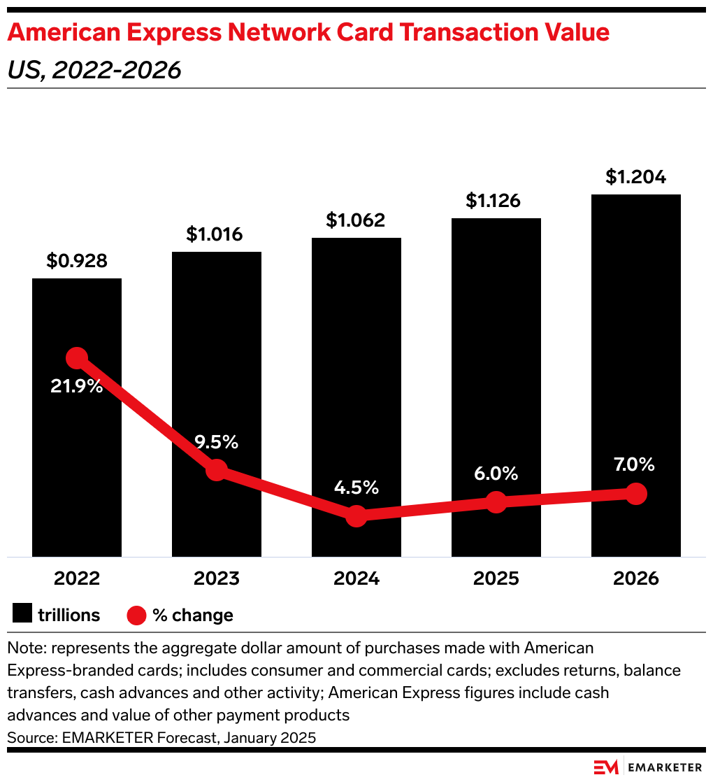 Our take: Amex is heading into 2025 in a strong position. We expect Amex’s card network transaction value will grow 6% YoY in 2025, per our forecasts.