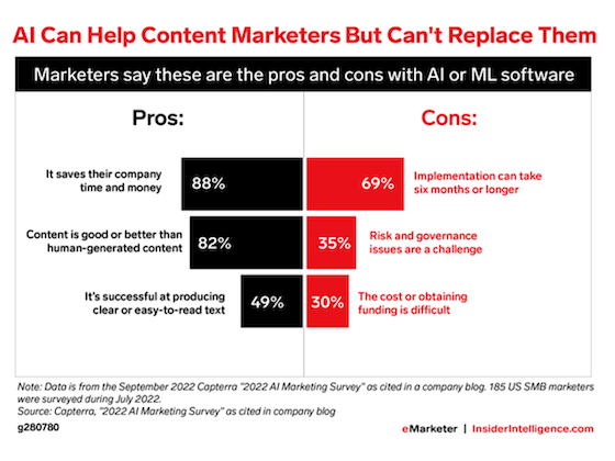 Nearly 90% of US marketers said AI or machine learning technology saves their company time and money, while 82% said the content it generates is as good as—if not better than—human-generated content, per Capterra polling from last July. At the time of the survey, marketers said implementation can take a long time, though this perspective may have shifted since ChatGPT burst on the scene.