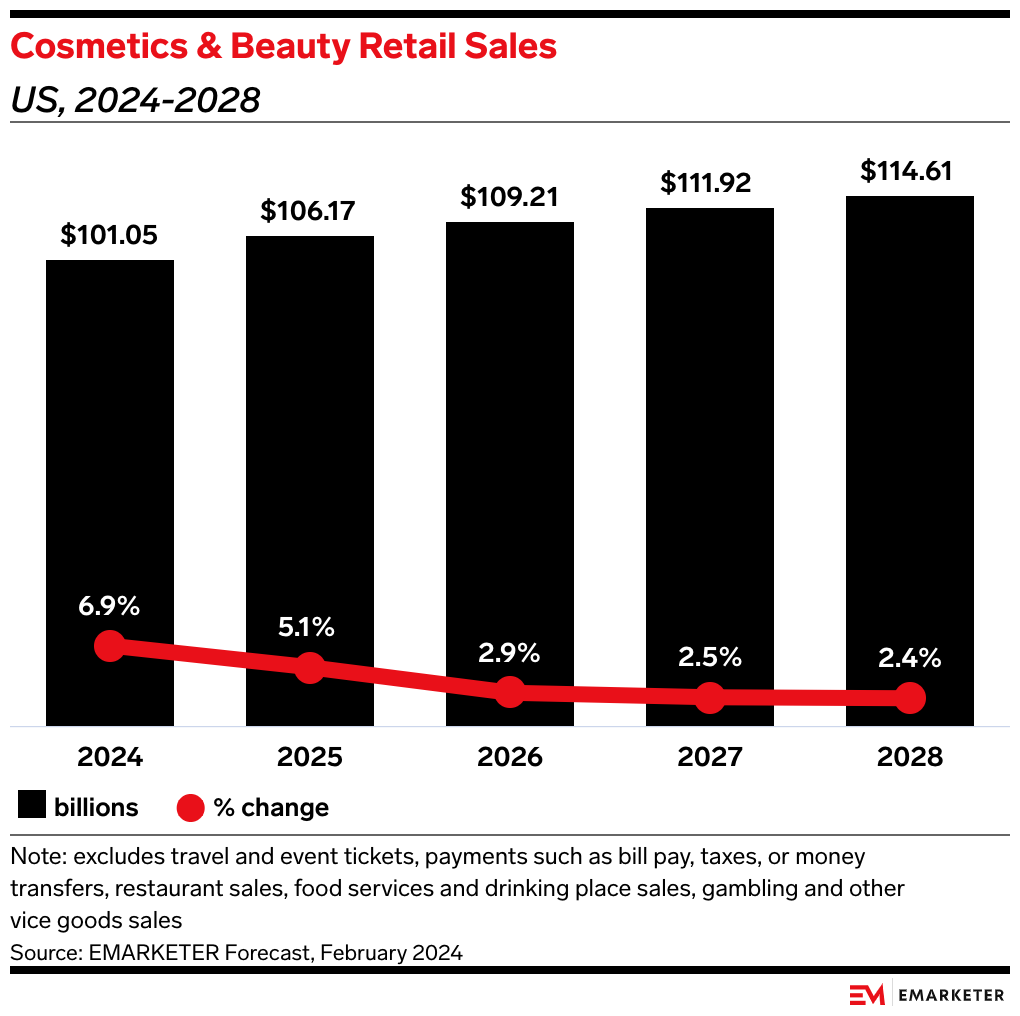 Zooming out: We expect the beauty industry will remain strong this year. Our forecast expects US cosmetics and beauty sales to grow 6.9% in 2024, which would significantly outpace the broader retail industry’s 2.8% growth.