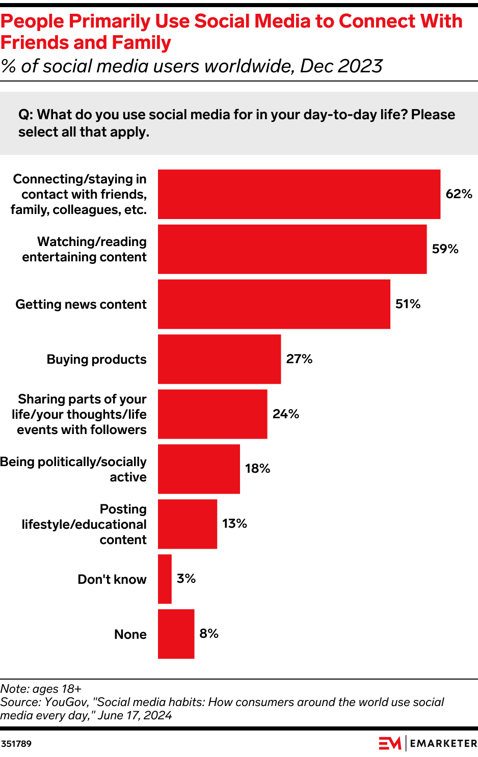 Key Stat: A significantly higher percentage of social media users (62%) used platforms to keep in touch with friends and family than to share updates, per a December 2023 YouGov survey.