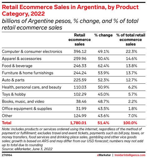 KEY STAT: Five product categories will account for nearly 80% of total retail ecommerce sales in Argentina this year. Food and beverage will be the fastest-growing category through 2026.