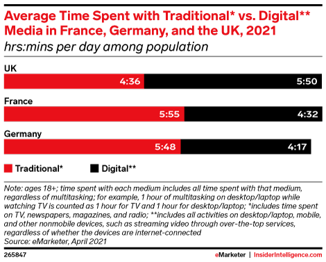 KEY STAT: In France and Germany, traditional media (influenced by TV time) is dominant and will account for 5:55 and 5:48, respectively, in 2021. The pattern is flipped in the UK, where digital time will reach 5:50 this year.