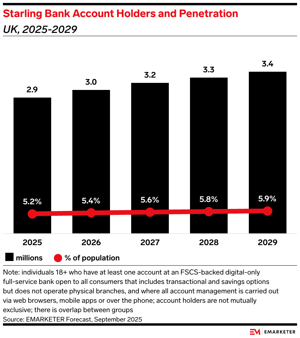 Starling has pushed into lending primarily through acquisition. It bought buy-to-let mortgage lender Fleet Mortgages in 2021 for £50 million ($39.1 million). Mortgages represented 92.1% of total lending as the company wound down government-backed lending as of its 2025 annual report. Its loan portfolio was £4.7 billion ($3.7 billion).