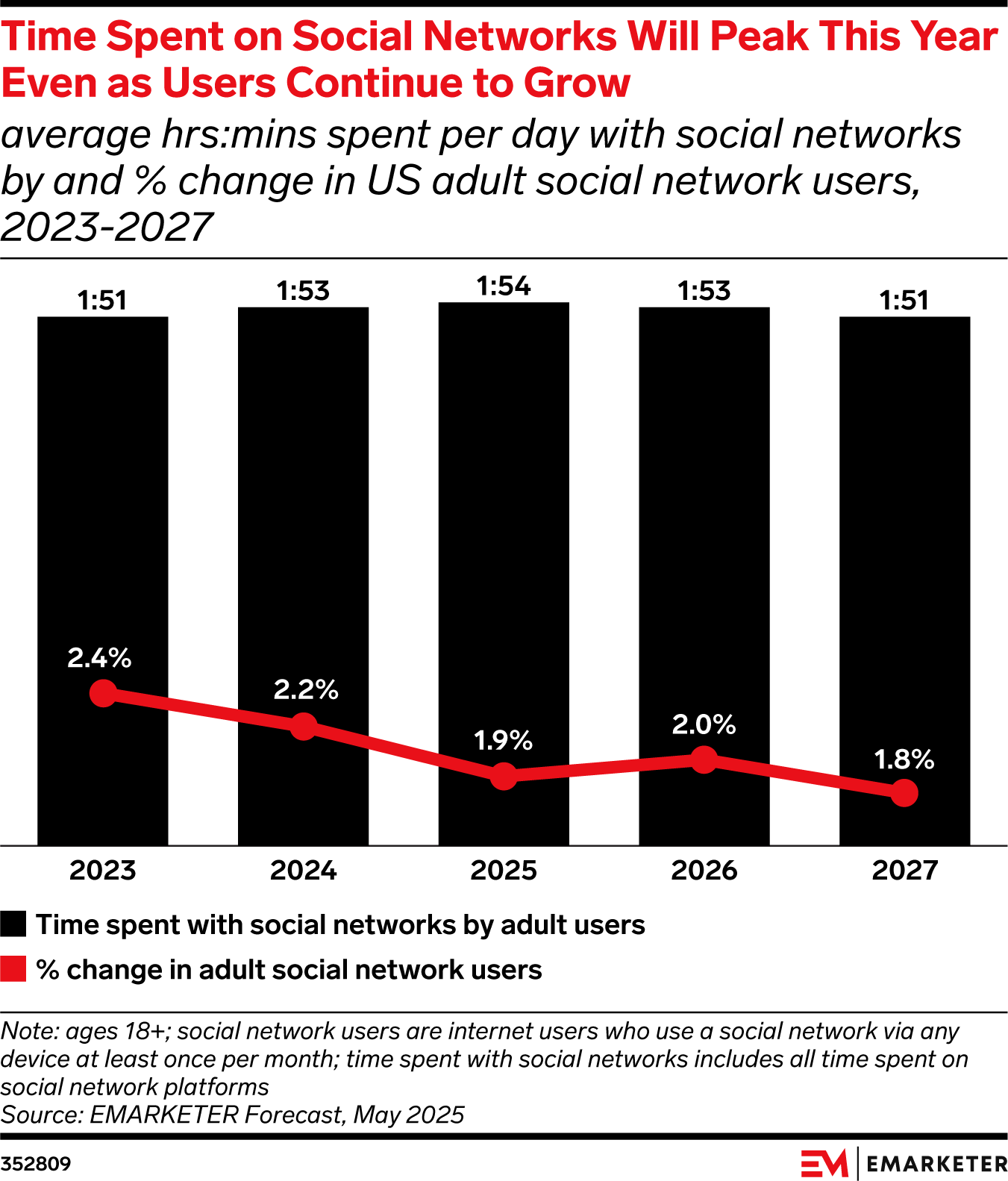Key Stat: Adult social network users will see YoY growth through at least 2029 in the US, even as time spent among this group peaks in 2025 at 1 hour, 54 minutes.