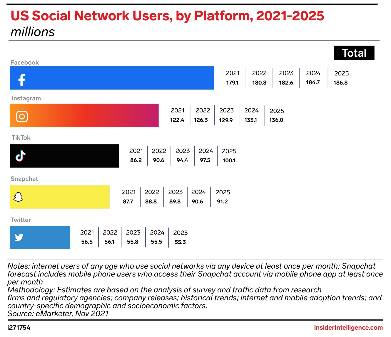 KEY STAT: TikTok will have 90.6 million monthly users in 2022, surpassing Snapchat users and Pinterest users but significantly behind Instagram and Facebook.