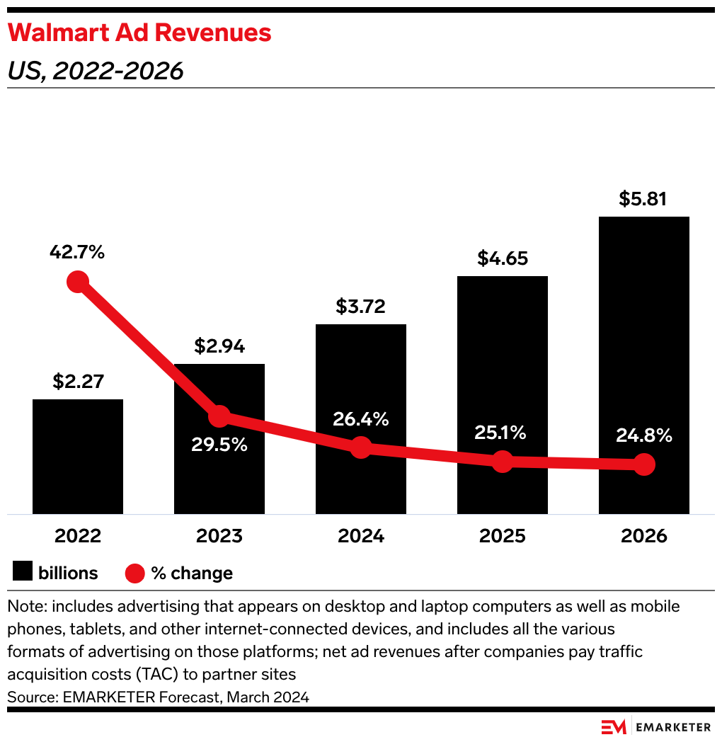 In context: Walmart’s ad growth of 26% surpasses that of its retail and commerce competitor Amazon, whose advertising unit grew 20% YoY, to $12.8 billion—and fell just short of expectations.