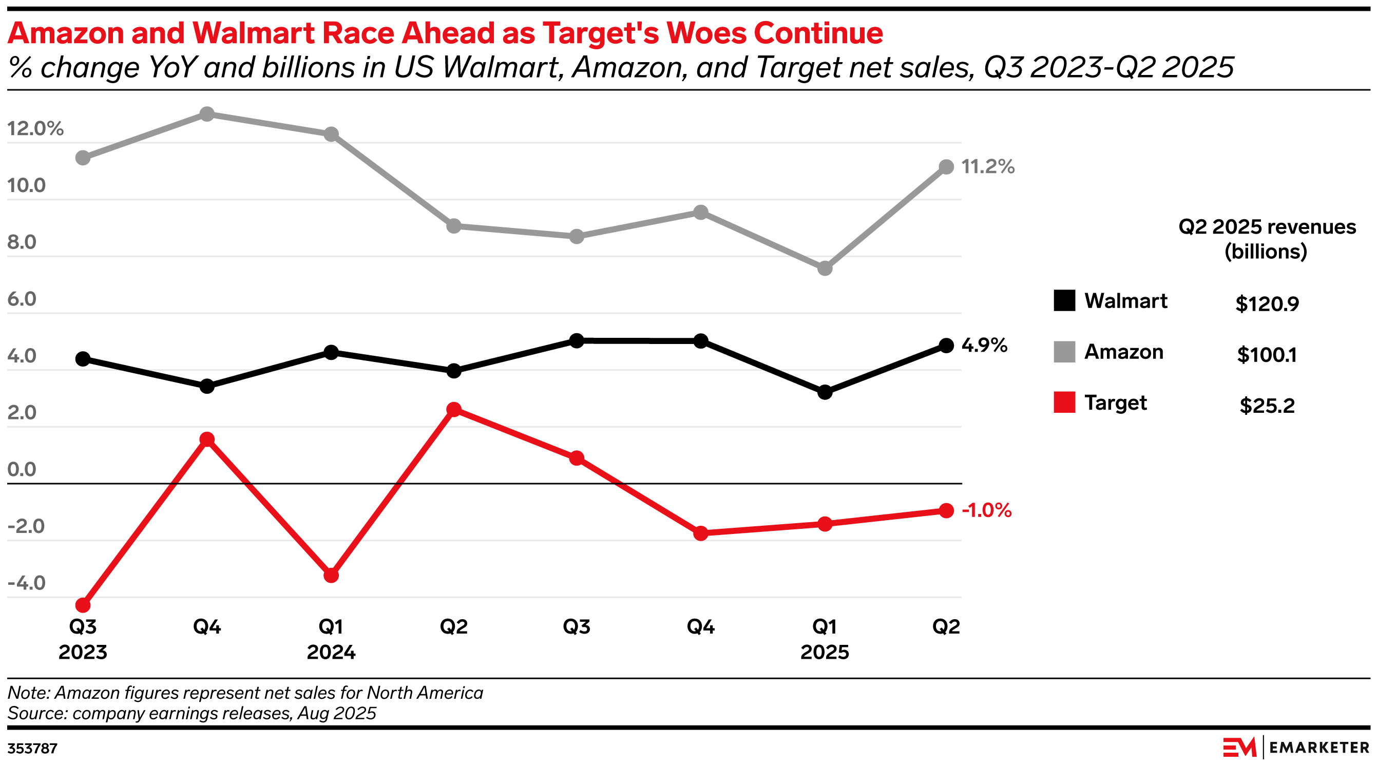 Q3 was another strong quarter for Walmart and Amazon, and another weak one for Target. Shoppers are showing a clear preference for the convenience, product selection, and overall value that Amazon and Walmart offer, while being less impressed by Target’s assortment and shopping experience. Economic uncertainty is heightening the gap, as more shoppers turn to Amazon and Walmart for necessities like groceries while pulling back on the discretionary spending that fuels Target. Walmart's and Amazon's ability to combine low prices with an extensive product selection and fast and convenient delivery will serve them well this holiday season, while Target has the harder task of convincing price-conscious shoppers to spend on nonessential items.