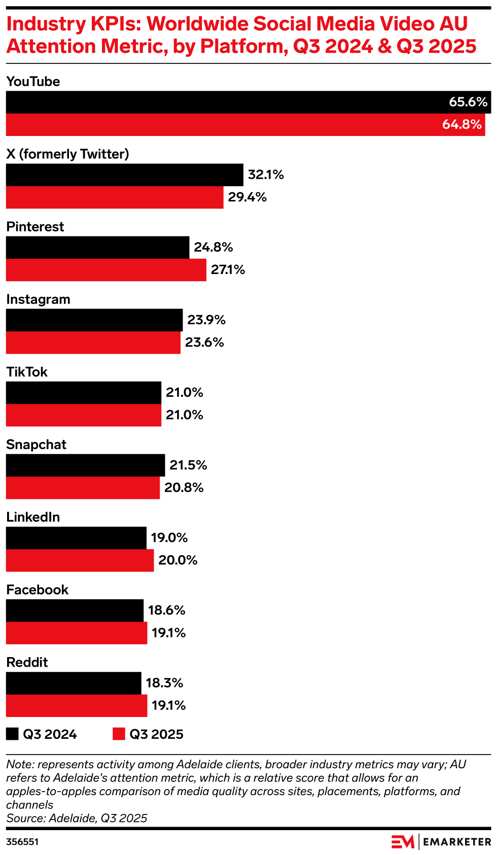 Attention metrics (AUs) in the social media video landscape are gradually fragmenting as audiences shift to platforms with interest-driven feeds, per our industry KPI data provided by Adelaide. Consumer attention fragmenting across platforms means that advertisers who are already struggling to reach target audiences on social media are facing an uphill battle. Focusing on interest-driven platforms like Reddit and Pinterest as they gain AUs can help drive stronger results, while maintaining investment in leaders like YouTube will remain essential.